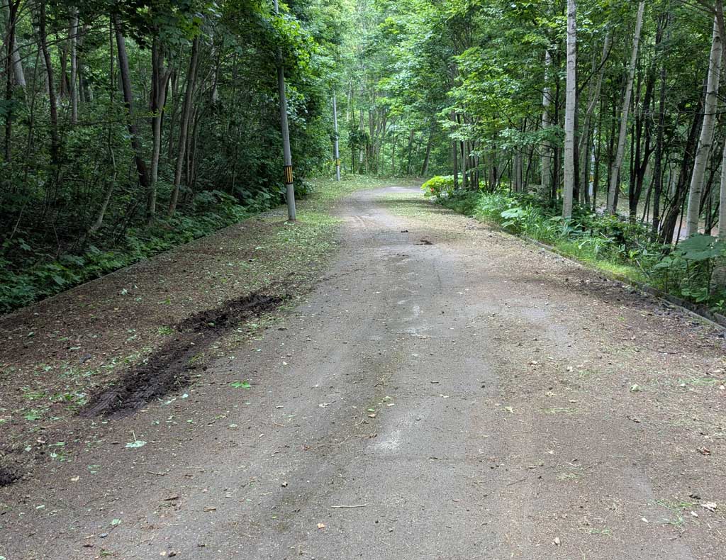 根本的には道路に迫りすぎた木々を少しでも減らすことが重要ですが、少しといっても道路全体では大規模な伐採になるので簡単ではありません。道路は400mほどあり、両脇に木が迫っているので自分で伐採していたら何年かかるかわかりません。業者を探してやってもらうしかなく、そちらは別途検討中です。
