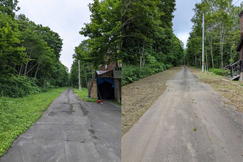 草刈りは大きく分けて私道の両脇と家の周囲に分けることができます。建物周囲の草は刈っておかないと風通しも悪いし虫が増えて家に入ってきやすくなります。また動物も家に近寄りやすくなるなど、良いことは一つもないので当然と言えば当然です。