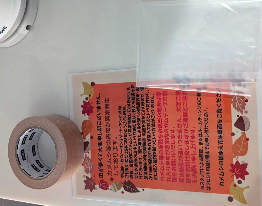 簡単に言えば「カメムシが大量に居るので客室等にも入ってくる。従業員を呼んでも対応に時間がかかる。自分で対処できるようガムテープと袋を用意した。」といった内容です。