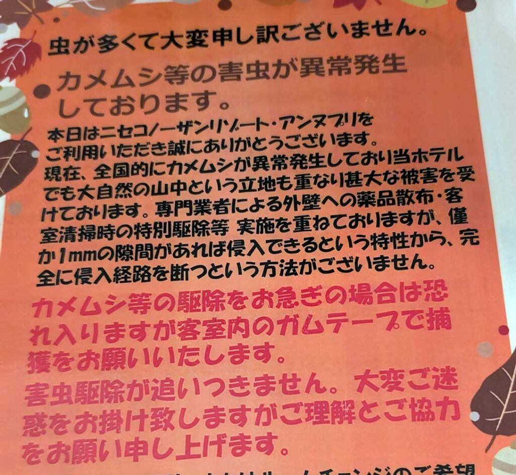スキー場のゲレンデ直結のホテルなので当然山の中です。「異常発生しております」と書かれるといかにも異常な事態のようですが、おそらく毎年カメムシは大量に居るはずです。