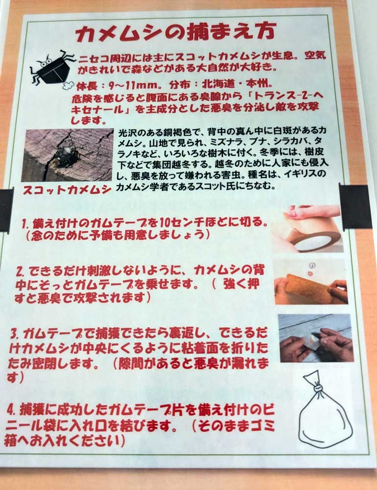 自分で対処するためのガムテープとビニール袋に加え、裏面にはカメムシに関する説明や捕り方などが書かれていました。親切だなぁと感じました。