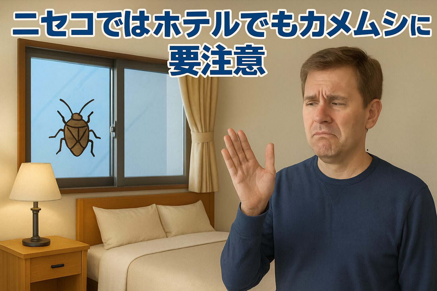 ニセコはスキーリゾートとして有名です。スキーに便利なホテルは山のすぐ麓にあります。要するに山の中のようなものなので、ホテルに滞在する際も一応カメムシに注意が必要です。